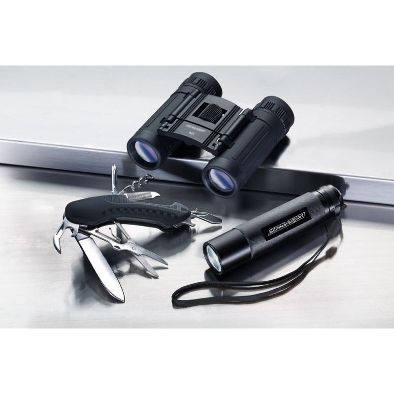 Alpina Sport 8 X 21, 3 delat set Alpina sport erbjuder instegsmodeller för aktiva människor som vill hålla ner kostnaden. Outdoorpaket i tre delar: Kompakt 8x 21mm kikare Ficklampa på 60 Lumen Fällkniv utrustad med kniv, sax, burköppnare, korkskruv, fil och skruvmejsel. Specifikationer Kikare/Ficklampa Förstoring: 8 Objektivlinsdiameter: 21 mm Ljusflöde: 60 Lumens