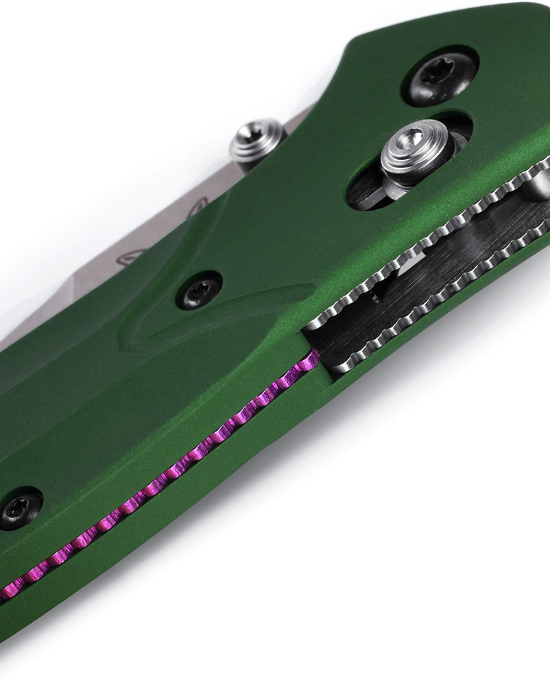 Osborne Designs 940 är en stor kniv i ett litet format och den perfekta kombinationen av elegans och funktion. Original utförandet har ett grönt aluminiumgrepp med lila anodiserade back spacer.