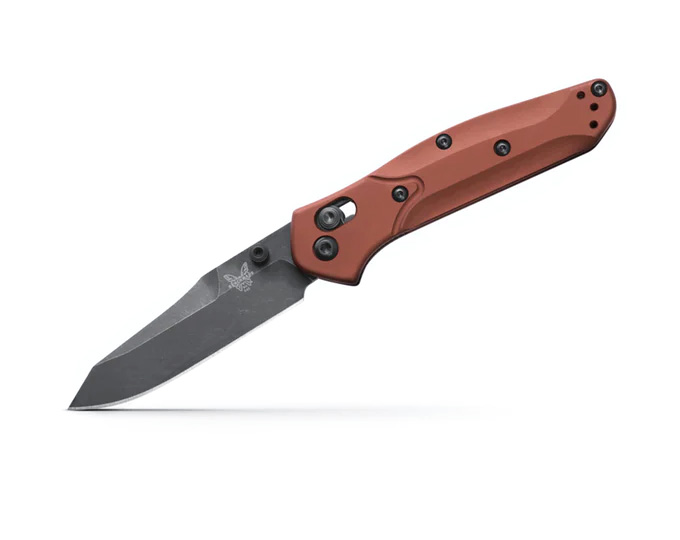 Benchmade 945BK-03 Mini Osborne Design Overland adventure requires fine-tuned preparedness to stay ready for the next challenge. The 945BK-03 Mini Osborne is our nod to the rugged folks who enjoy dusty, gritty, challenging treks across natural terrain. The new compact Mini Osborne variant features a wear-and corrosion-resistant CPM-MagnaCut reverse tanto blade with a DLC Battlewash finish and Burnt Copper Anodized 6061-T6 aluminum handle scales dotted with mean black oxide hardware. Lightweight, versatile, and timeless, the 945BK-03 Mini Osborne is easily pocketable and an effective backup for the truck, the camper, and your day pack.