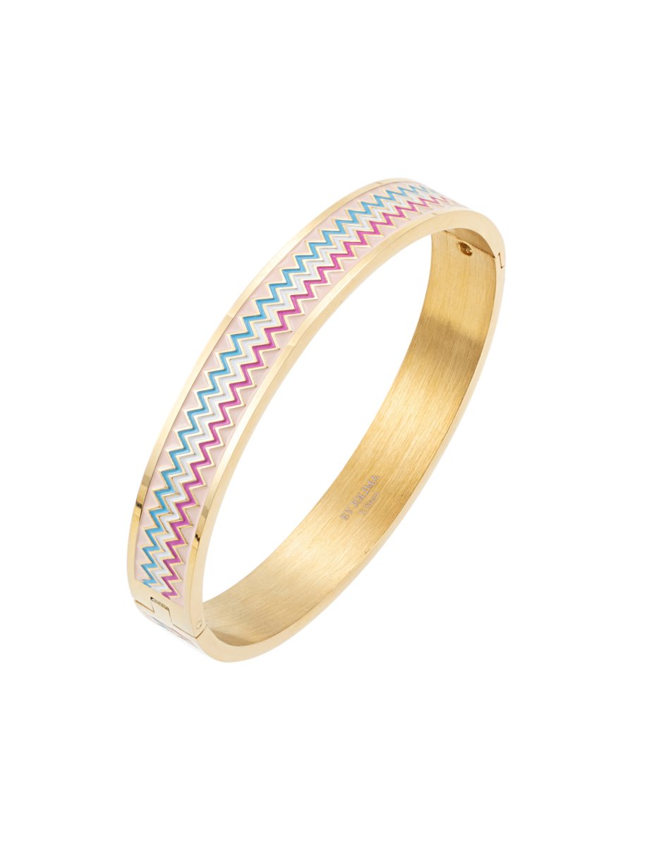 Antibes bangle i multicolor har ett sofistikerad och lyxigt modernt uttryck som passar för alla tillfällen. Den klassiska armringen här med ett läckert sick sack mönster i färgerna rosa, blå och vit. Det är öppningsbart, lätt att ta på och av, och du låser det enkelt med hjälp av ett litet klicklås.