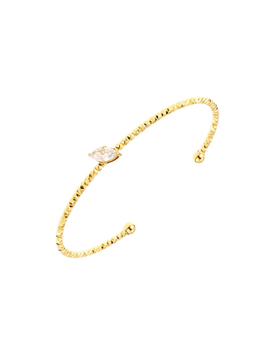 Ett smycke som förkroppsligar enkelhet och elegans. Det tunna armbandet i gyllene ton bärs lätt mot handleden och lyfts av en gnistrande kristallsten i mitten – en diskret detalj som fångar ljuset