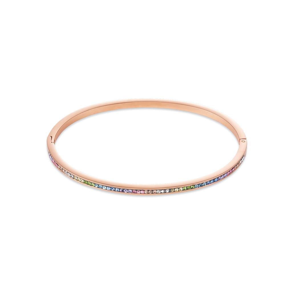 En smalare armring i rosepläterat stål med regnbågsfärgade kristaller. Armringen har ett enkelt klicklås och är oval i formen för bästa komfort och passform.