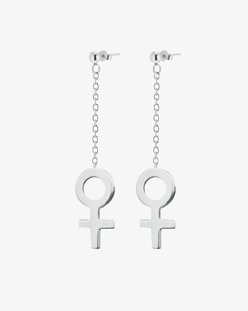 Ett par silverörhängen på stift med kedja och blankpolerad Venus symbol.