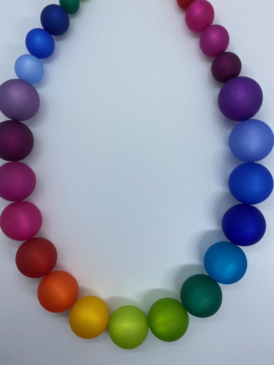 Halsband av färgad kåda. Handgjorda halsband gjorda utav färgad kåda med en dekorativ metallgrå kula. Halsbanden är doserade och trädda på vajer med en förlängningskedja i silver.