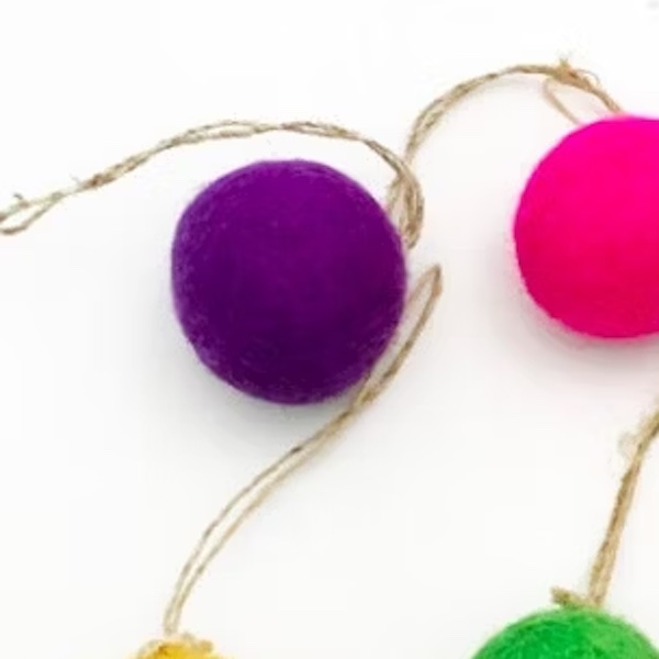 Fyra gulliga påskbollar av ull med grövre snöre som dekoration i påskriset, på paketet eller i ett blomsterarrangemang.