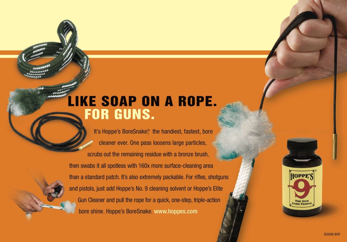 Med Hoppe´s Boresnake rengör du ditt vapen med en oslagbar snabbhet. Dra läsk-snöret genom pipan. Första delen tar bort grova partiklar, den integrerade bronsborsten skrubbar sedan pipan och den återstående delen rengör med en yta som är: