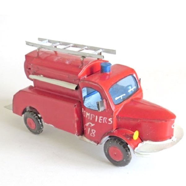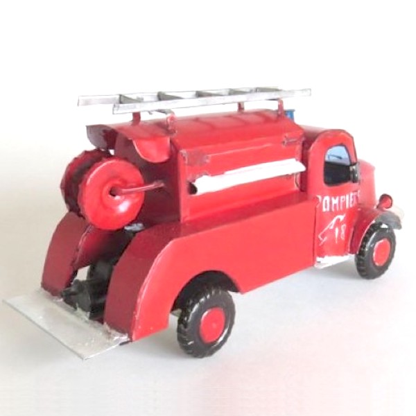 Handgjord klassisk brandbilsmodell av insamlade metallburkar, dvs metallskräp med stege på taket och rulle med vev för brandslangar bak. Ett skickligt och detaljrikt hantverk från Madagaskar.