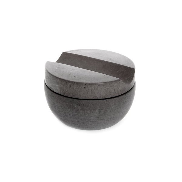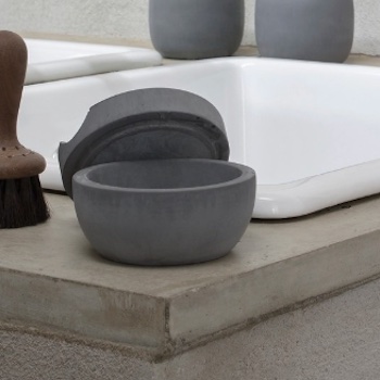 En stilren rakkopp tillverkad i mörkgrå betong, känslan av att ta i materialet är skön då det känns varmt, mjukt och behagligt. Betongen innehåller en liten del polymer vilket gör den elastisk och följsam men den är inte så mjuk att den går att böja, det är fortfarande ett stenmaterial. Locket har en formats för att kunna ha en rakborste liggandes på.