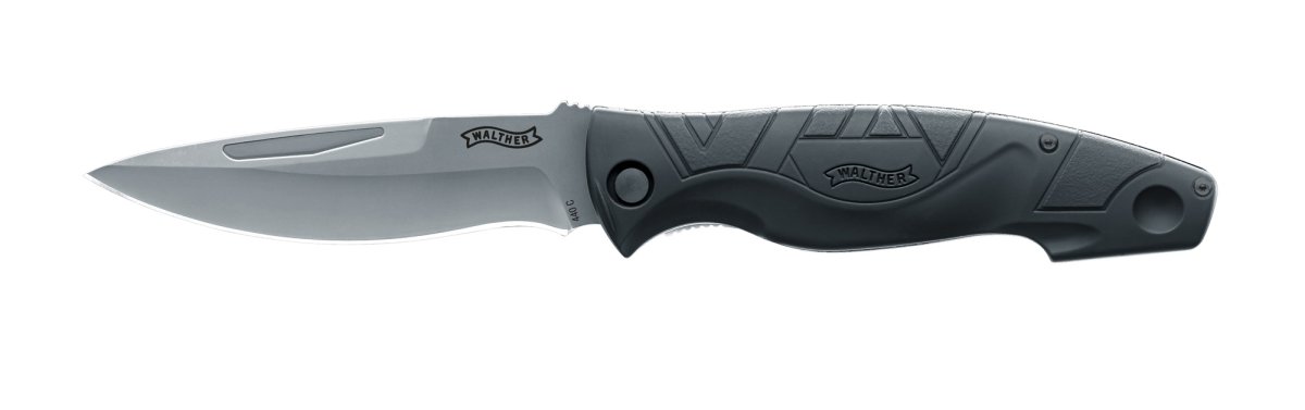 Walther TFK, Fällkniv, Allround Slimmad allroundkniv med bra grepp i gummiöverdragen G10. TFK öppnas med två händer som är ett krav i vissa länder. Specifikationer Vikt: 184 g Totallängd: 245 mm Blad: Steel 440 C Bladlängd: 110 mm Greppmaterial: Gummiöverdragen Bladmodell: Speapoint Låstyp: Linerlock